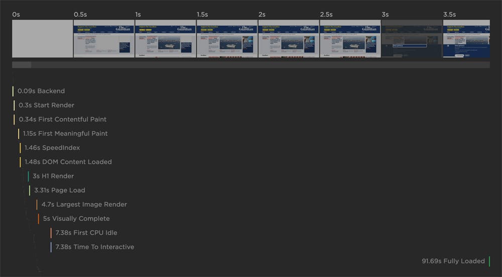 それでは、 「Start Render」 、 「Speed Index」 、 「Visually Complete」 の3つの指標を見てみましょう。これらの指標は、ユーザーが認識する表示スピードと競合する場合もあります。(Web表示スピード基準の便利な用語集はこちらです。)